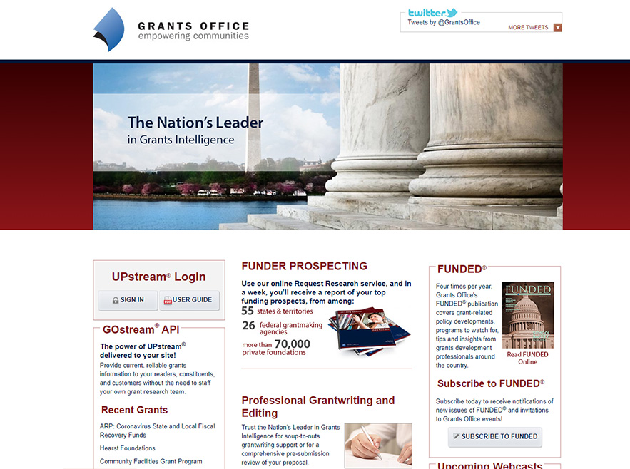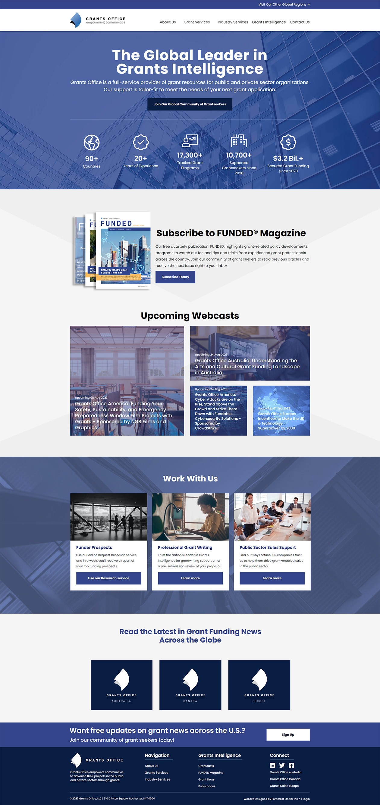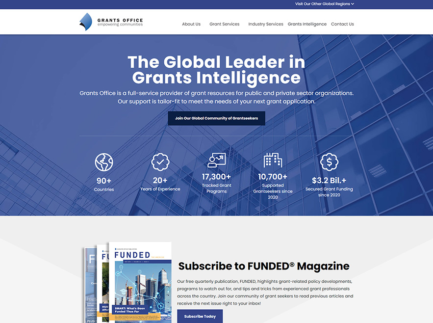 With the “under the hood” work complete, our next task was a complete redesign of the Grants Office website. This extensive overhaul resulted in a whole new look and feel for the site. The old red color scheme didn’t match the logo, so we switched to a shade of blue to complement and enhance their branding. Top-level navigation was added to the homepage, making it easier for visitors to find what they are looking for quickly. An improved, user-friendly layout includes upfront information about the services they provide, graphics showcasing their achievements, and links to resources such as global funding news, webcasts, and a quarterly publication. The addition of clear CTAs encourages users to take action.