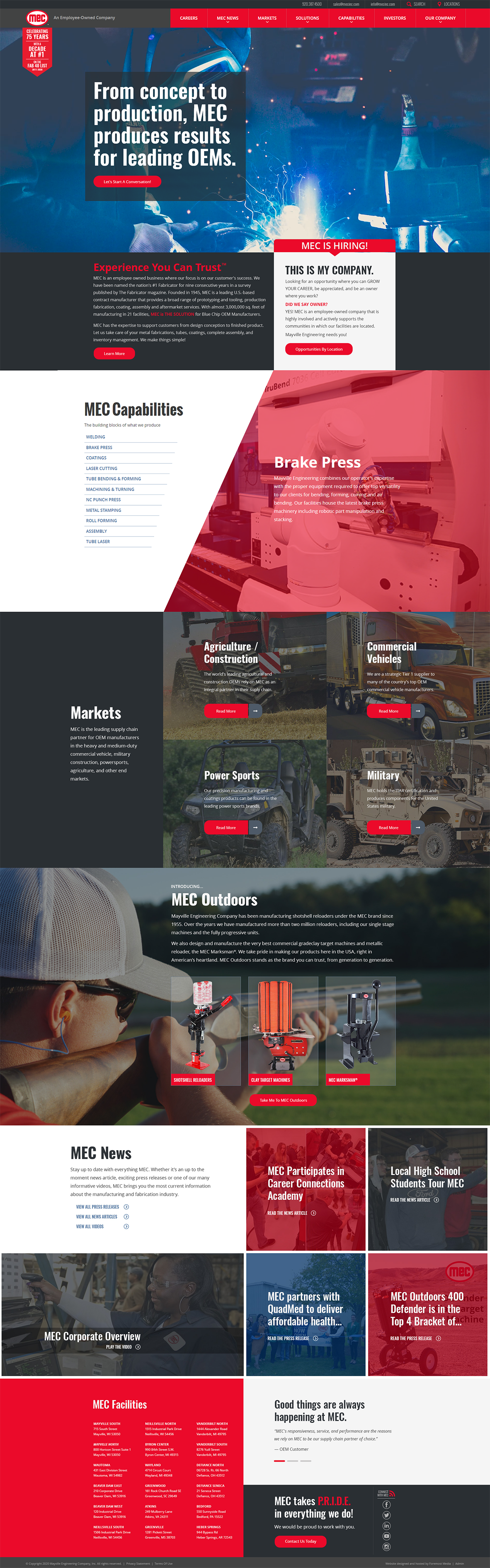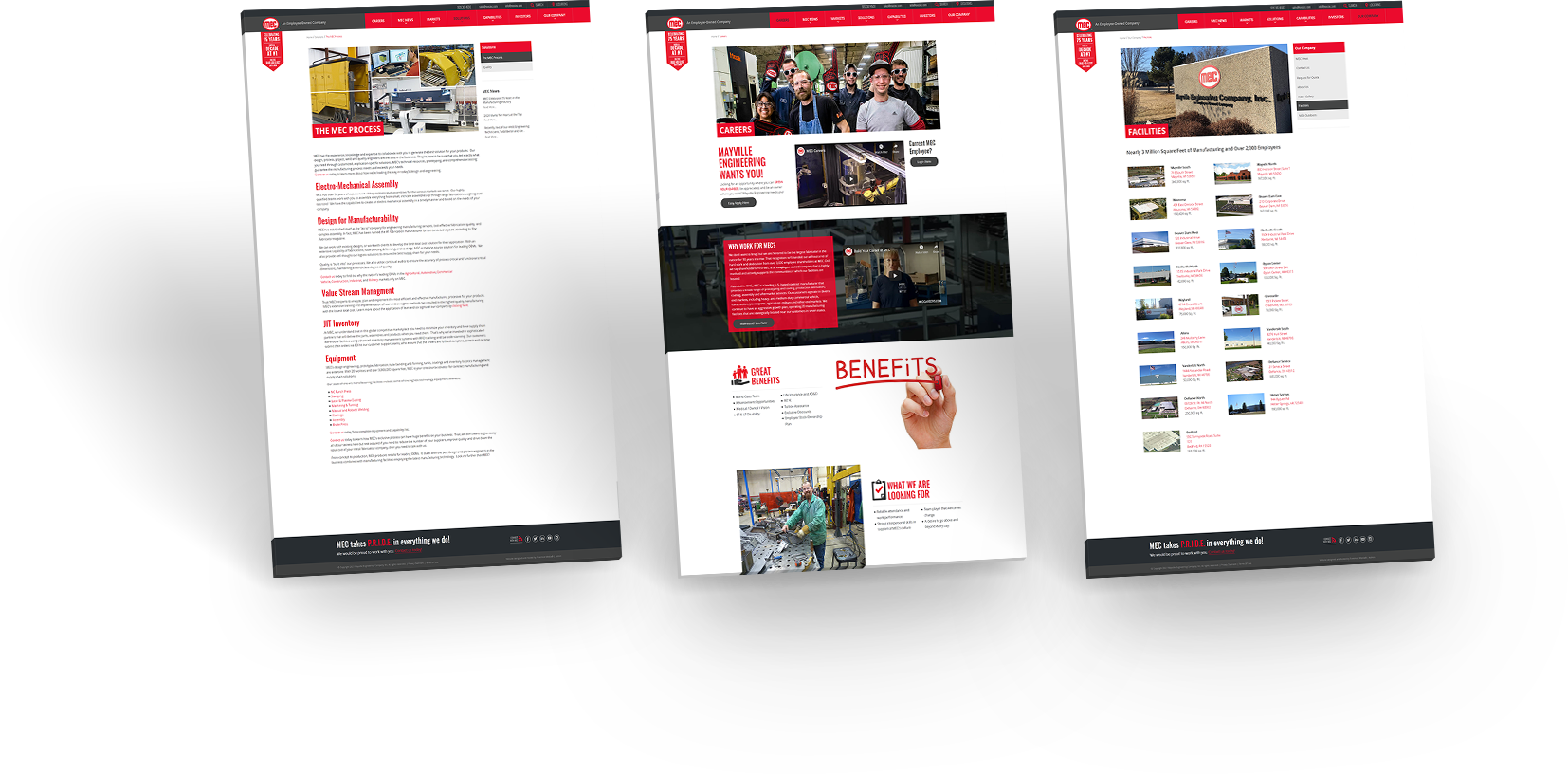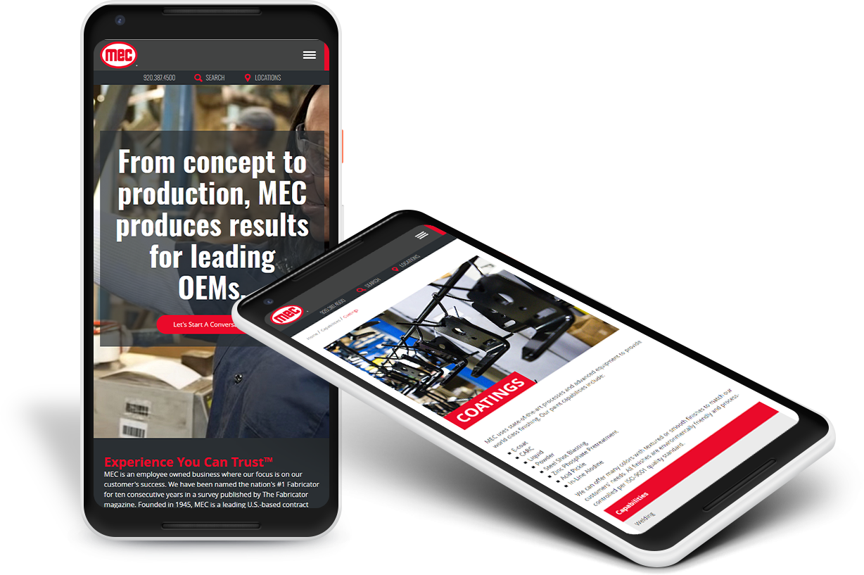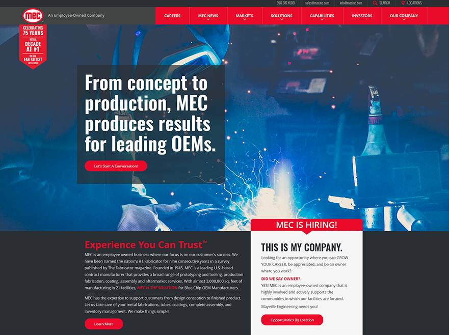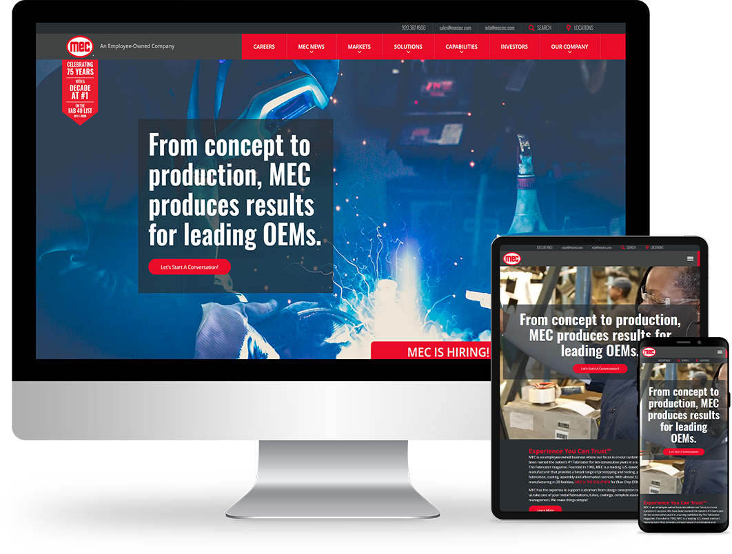 When MEC approached us to redesign their new contract manufacturing website, a couple of main objectives for the redesign was to showcase MEC’s wide range of capabilities and promote their employee-owned company culture. MEC also expressed that they wanted to stand out from their competitors’ websites. To help with this objective, we added Parallax effects to their home page to bring their services to life, like the animation that shows one of their products being assembled at the end of the homepage.