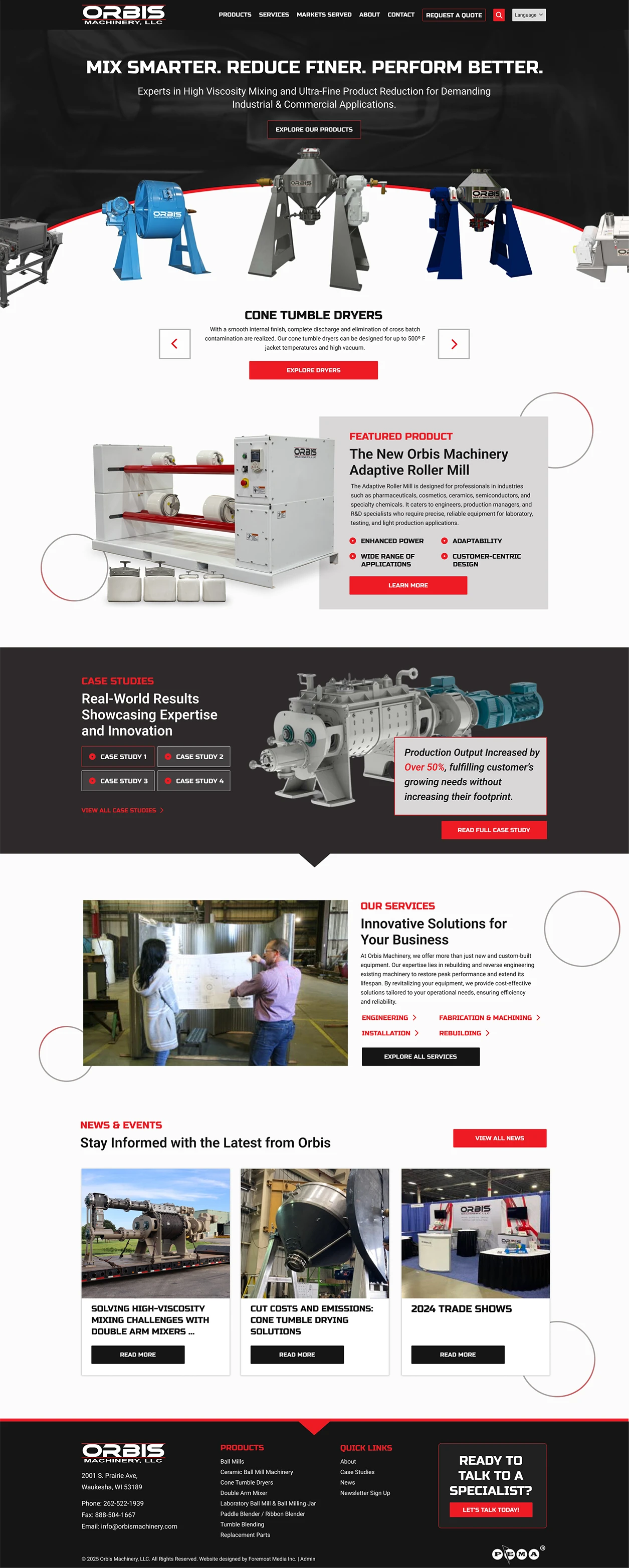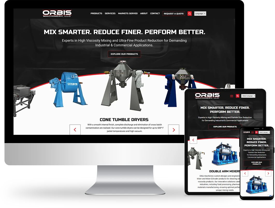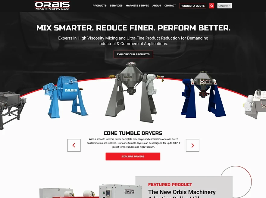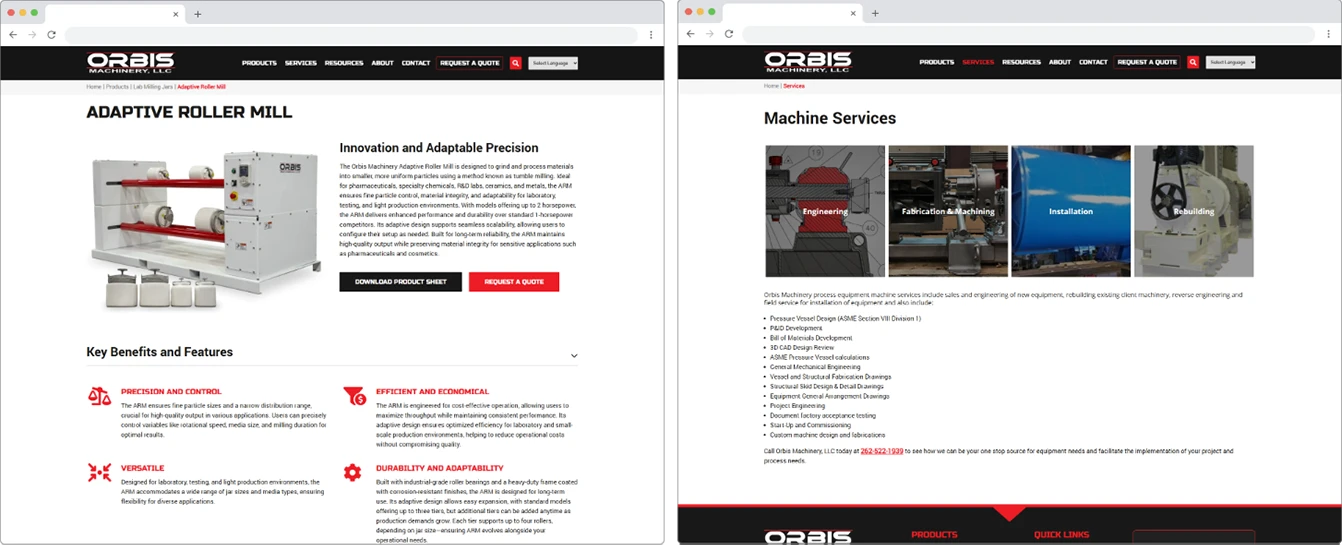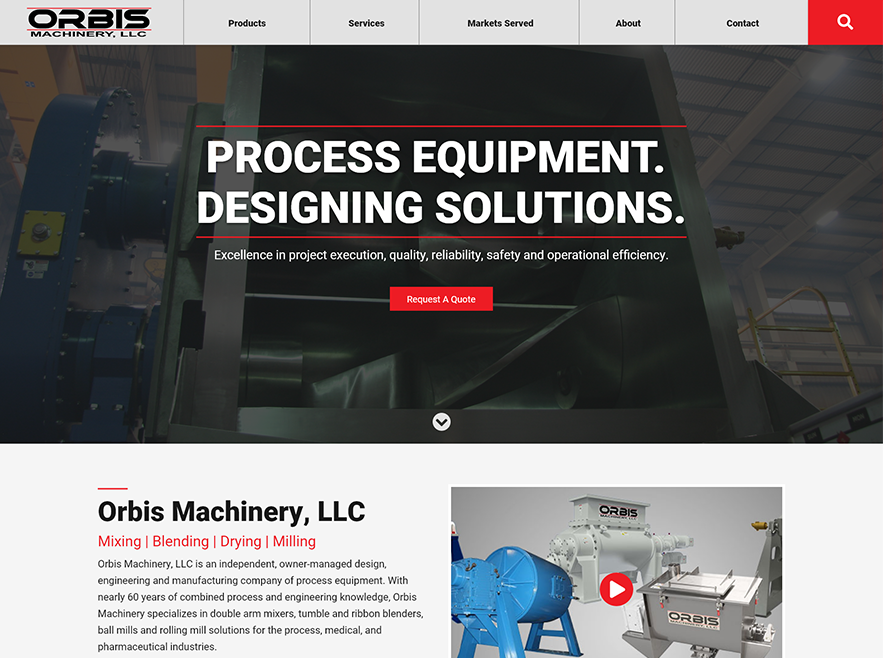Orbis Machinery was a fully custom site redesign project that focused on updated usability. Built in WordPress, we updated the site map and navigation for a better user experience, making the product downloads and information easier to find and incorporating clear calls to action through the addition of bold red buttons (request a quote, learn more, etc.). Most of the existing content was carried over from the old site, but we refined the “Markets Served” page to provide more context regarding the unique markets Orbis Machinery serves; prior to the upgrade, the page was nothing more than a list, but now includes detailed information explaining the manufacturing process for each industry. To further illustrate the client’s quality of work and attention to detail, we added before and after images of the rebuilding process.
